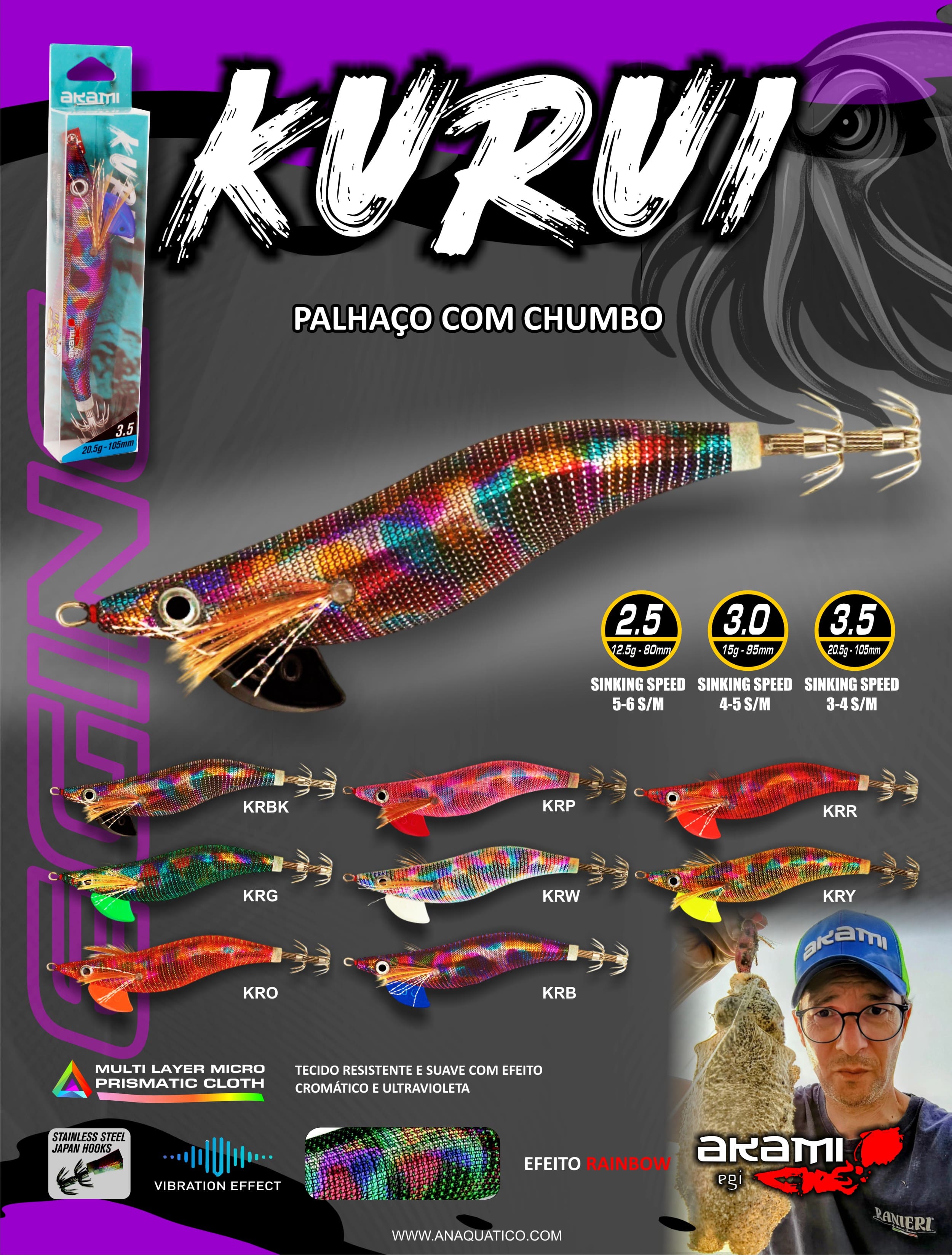 Apresentamos a AKAMI KURUI, uma obra-prima da tecnologia japonesa, criada por engenheiros nipónicos com a máxima precisão. O que mais se destaca nesta extraordinária toneira (palhaço) é o seu deslumbrante efeito rainbow, otimizado por tratamentos UV que a tornam especialmente eficaz em águas escuras e claras! Projetada para atrair lulas e chocos com eficiência, a AKAMI KURUI combina inovação e performance para proporcionar uma experiência de pesca incomparável. O seu design aerodinâmico e meticulosamente balanceado garante uma animação fluída e realista dentro de água, aumentando as probabilidades de captura. O chumbo pintado é uma mais valia tornado esta torneira mais visível e o seu formato de quilha oferece uma estabilidade excepcional, permitindo um controlo preciso e uma pesca extremamente eficaz, mesmo nas condições mais exigentes! Equipada com agulhas de aço inoxidável robustas, estas são sinónimo de durabilidade e resistência. Estes componentes de alta qualidade garantem uma longa vida útil, assegurando que cada captura é feita com máxima segurança e eficiência. O tecido de última geração, feito de multi-layer micro-prismatic cloth, é uma inovação revolucionária. As camadas microprismáticas refletem e refratam a luz, criando vibrações irresistíveis para os cefalópodes, especialmente em condições de baixa luminosidade. O seu efeito ondulado intensifica ainda mais a atração, produzindo vibrações dentro de água que tornam a AKAMI KURUI mais sensorial e a escolha ideal para os pescadores mais exigentes. Seja qual for a condição de pesca, a AKAMI KURUI é a aliada perfeita para maximizar as suas capturas. Atrai, captura e impressiona!