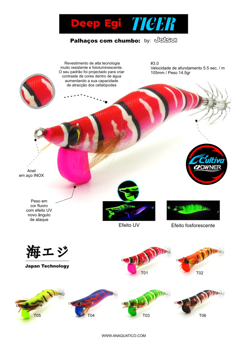 Os Deep Egi foram projectados com tecnologia de ponta Japonesa. Eles são cobertos por um tecido texturizado ultravioleta, onde a fosforescência faz parte do próprio tecido, não sendo preciso um tratamento exterior para esse efeito, isso torna a sua fosforescência decididamente mais durável e atraente. Neste modelo TIGER, as cores foram projectadas para criar maior contraste dentro de água, aumentando a sua capacidade de atracção. O seu chumbo é calibrado e vem pintado com cores atractivas.