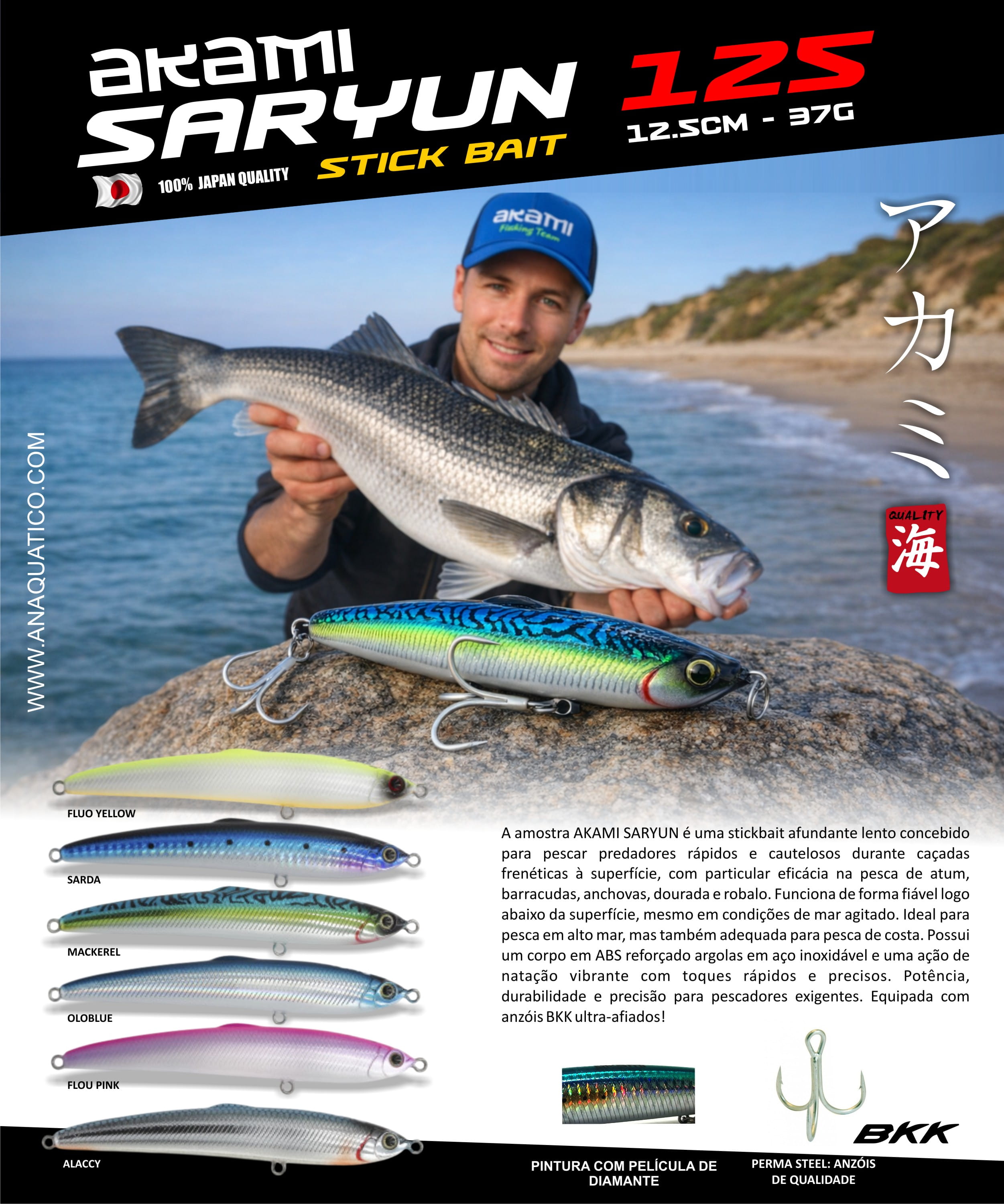 A amostra AKAMI SARYUN é uma stickbait afundante lento concebido para pescar predadores rápidos e cautelosos durante caçadas frenéticas à superfície, com particular eficácia na pesca de atum, barracudas, anchovas, dourada e robalo. Funciona de forma fiável logo abaixo da superfície, mesmo em condições de mar agitado. Ideal para pesca em alto mar, mas também adequada para pesca de costa. Possui um corpo em ABS reforçado argolas em aço inoxidável e uma ação de natação vibrante com toques rápidos e precisos. Potência, durabilidade e precisão para pescadores exigentes. Equipada com anzóis BKK ultra-afiados!